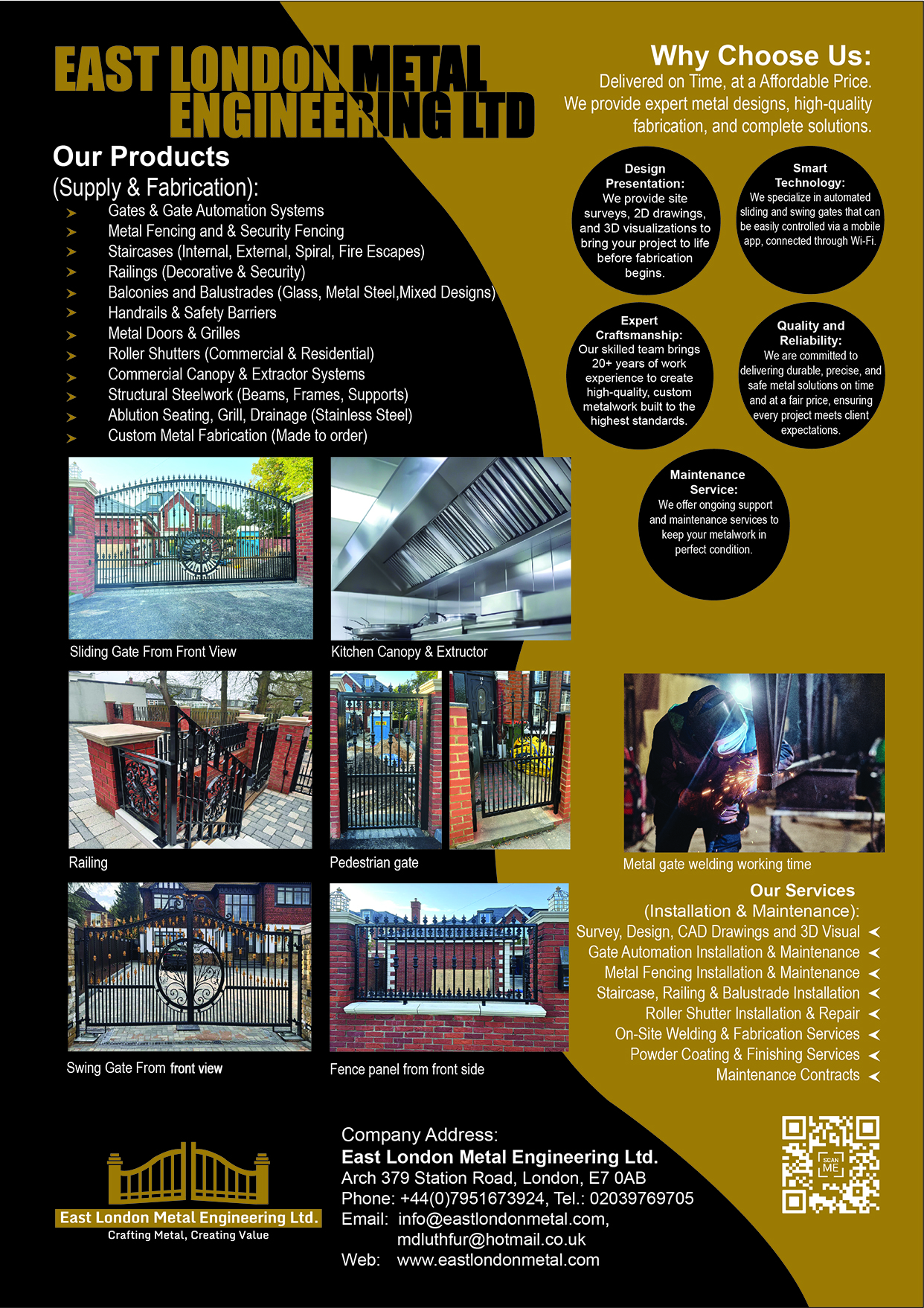 Our experienced team specialises in a wide range of products, including metal gates, staircases, fencing, railings, roller shutters, security doors, commercial canopy, and custom steelwork. No project is too big or too small – whether it’s a large construction project or a minor repair, we approach every job with the same dedication to quality and service. At the heart of our business is a commitment to craftsmanship and customer satisfaction. By blending innovation with tradition, we ensure that every client receives reliable solutions, exceptional workmanship, and long-lasting results.